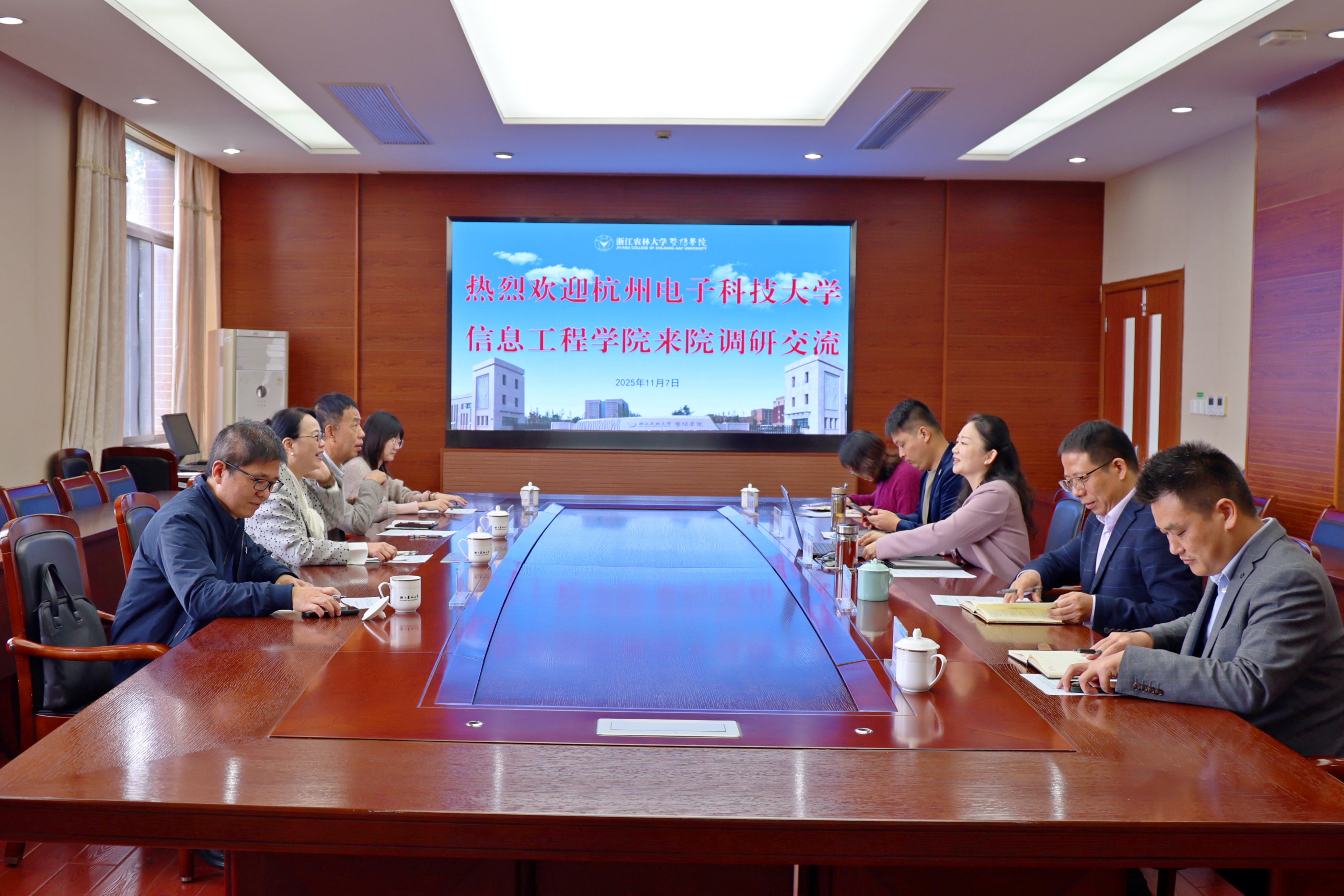 11月7日,学院党委书记王艳、副院长卢文军一行带队先后前往浙江农林大学暨阳学院、中国计量大学现代科技学院开展走访调研。此次调研以“深化党建交流、凝聚发展合力”为核心主题,通过实地考察、座谈交流等形式,深入探讨校际党建工作创新、品牌建设及发展路径,为校际党建高质量合作奠定基础。浙江农林大学暨阳学院党委书记洪昀、副院长金松恒热情接待了王艳书记一行,介绍了暨阳学院的发展历程和以应用型人才培养为核心的办学特色,分享了党建与业务深度融合的实践与成效。暨阳学院始终坚持党建引领,以高质量党建为育人中心工作和学院发展大局持续注入强大动能。王艳介绍了学院基本情况,希望以此次交流为契机,搭建长效沟通桥梁,在“十五五”规划布局、科研协同等方面互学互鉴,携手实现共同发展。王艳书记一行实地参观了陶朱商学院、晨晓艺术学院和体育馆,直观感受学院的办学环境与特色发展成果。下午,王艳一行抵达中国计量大学现代科技学院,现代科技学院党委书记叶子弘表示热烈欢迎。在办学成果展厅,她详细介绍了学院办学历史、专业设置、师资力量以及近年来校地融合发展所取得的成果。在座谈会上,双方就党建工作、校地融合、高质量发展等方面展开深入交流。双