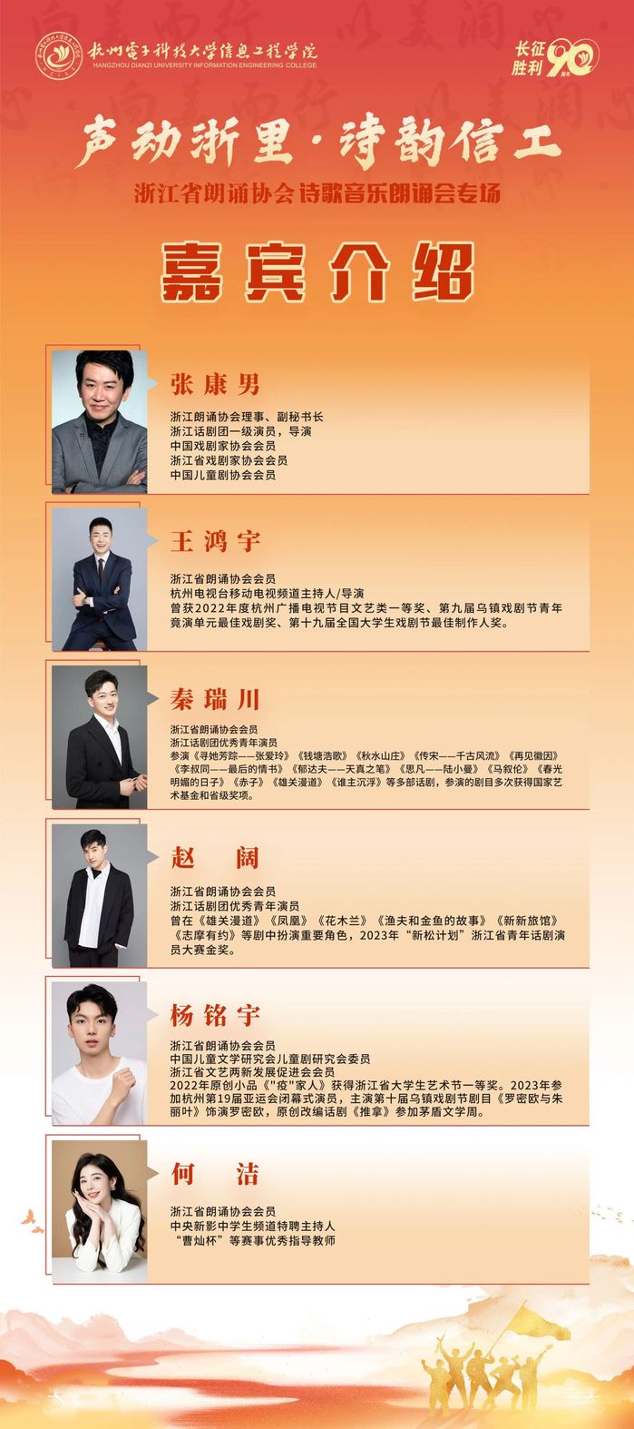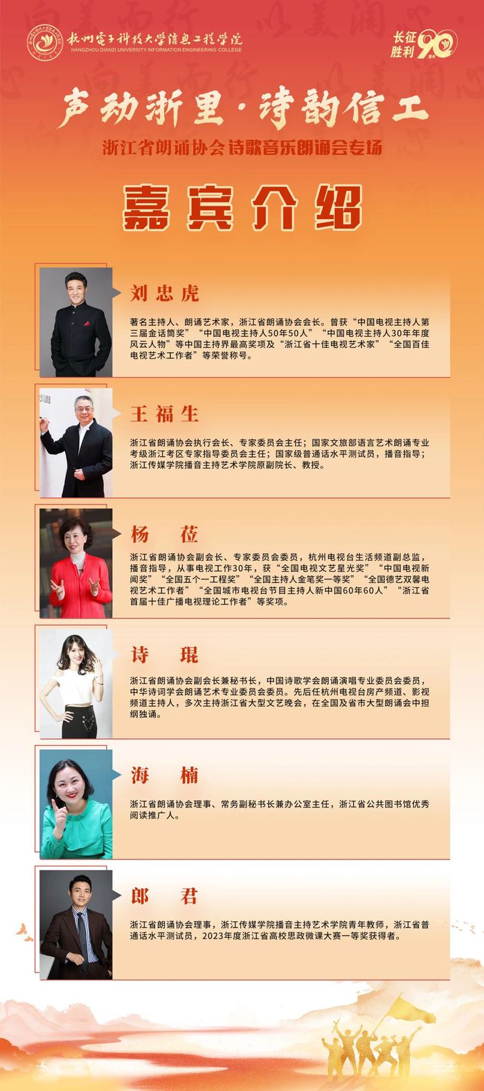 2026年是红军长征胜利90周年,为传承红色基因,赓续红色血脉,11月26日,杭州电子科技大学信息工程学院纪念红军长征胜利90周年“声动浙里•诗韵信工”浙江省朗诵协会诗歌音乐朗诵会(美育文化节系列活动)在湖畔广场圆满举办。