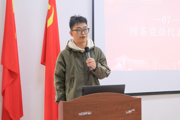 2023级电子信息工程专业学生康浩楠作为新发展党员代表发言,他回顾了自己的入党初心,畅谈了未来规划,表达了牢记誓言、不负韶华的坚定信念。