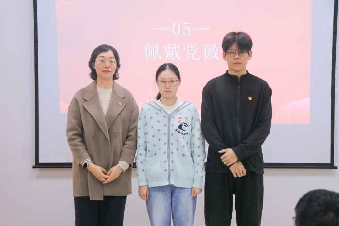 随后,电子工程学院党总支副书记马焕郑重宣读预备党员名单。在庄严的党旗下,郑皓为新党员代表逐一佩戴党员徽章,一枚枚闪耀的党员徽章既是荣誉的象征,更是沉甸甸的责任与使命。在学院领导的见证下,由电子工程学院党总支书记俞优姝领誓,全体预备党员面向党旗庄严宣誓,铿锵誓言彰显对党忠诚与奋斗终身的决心。