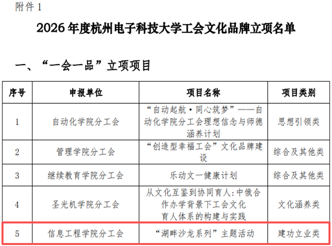 日前,杭州电子科技大学工会正式公布了2026年度杭州电子科技大学工会文化品牌项目评审结果。由我院组织申报的“湖畔沙龙系列”主题活动成功入选“一会一品”文化品牌立项名单,体现了学院在用心用情服务教师、推动教师交流融合上不断取得新实绩。