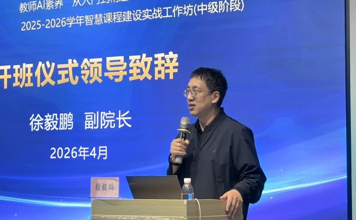 为深入贯彻落实国家教育数字化战略,加快推进人工智能与教育教学深度融合,系统化提升教师AI素养与教学创新能力,4月8-9日,学院成功举办教师AI素养“从入门到精通”分阶段全员研修计划暨2025-2026学年智慧课程建设实战工作坊(中级阶段)活动。本次活动由教师教学发展中心与教务处联合举办,各二级学院协办,采用线上线下融合模式进行,吸引全院90多位教师参与研修。学院副院长徐毅鹏出席开班仪式并致辞。