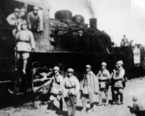 铁道游击队沙沟受降仪式后,队员们在火车前的合照