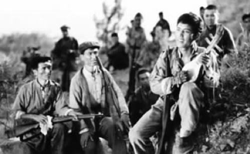 电影《铁道游击队》中游击队员们在战斗之余休息歌唱的场景