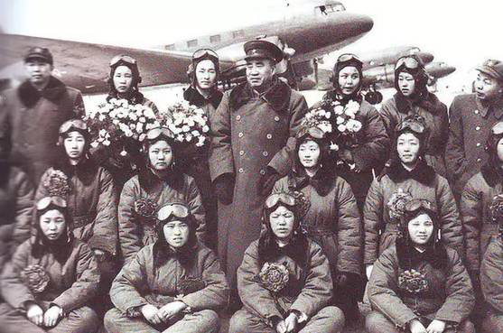 朱德总司令与第一批女飞行员合影