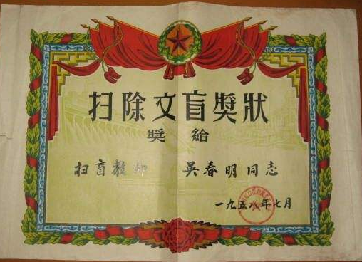 △当年的扫除文盲奖状