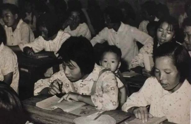 △解放初期,妇女背着孩子参加扫盲识字班