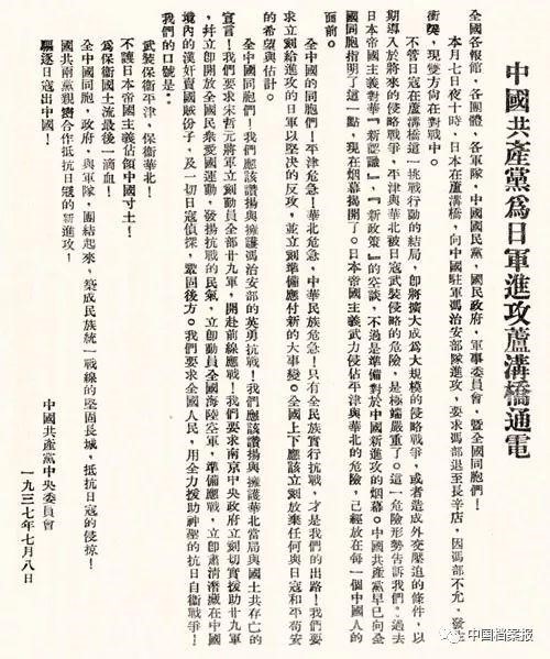 来源:百年瞬间丨《中国共产党为日军进攻卢沟桥通电》(12371.cn)