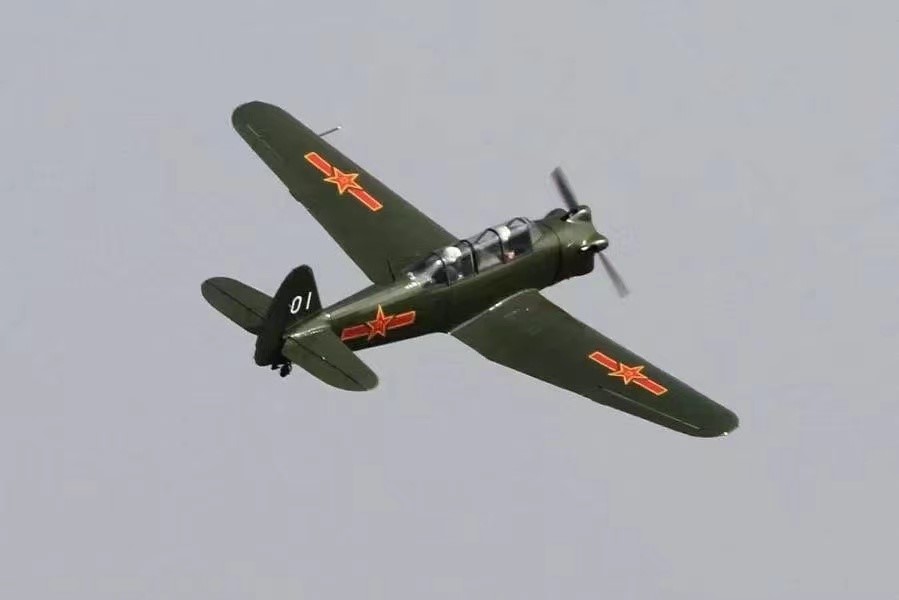 现场解说:大家现在看到的在天空当中翱翔的是新中国制造的第一架飞机“初教-5”。