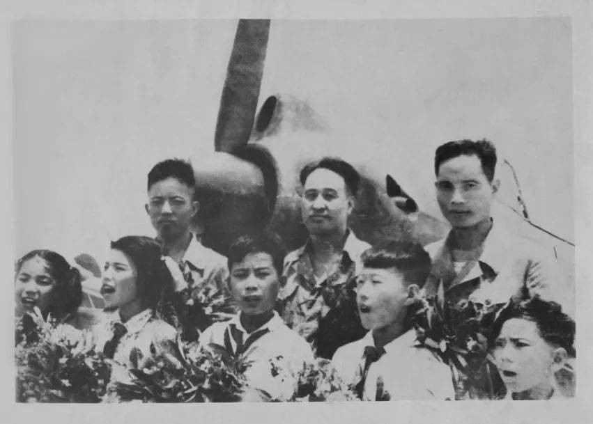 试飞典礼大会上试飞员与少先队员合影