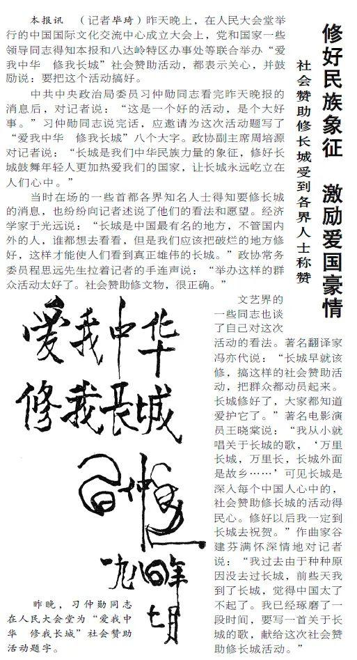 万里长城是中华民族的精神象征,新中国成立后,国家成立了专门的机构进行管理和修复。1984年7月5日,《北京晚报》等单位联合发出启事,号召社会力量赞助修复长城。第二天,时任中共中央政治局委员、书记处书记的习仲勋在人民大会堂说:“这是一个好的活动,是个大好事”,并欣然为这次活动题写了主题:“爱我中华,修我长城”。
