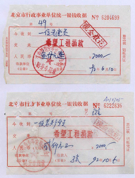 中国青基会工作人员:在92年,小平同志两次让他的工作人员来捐款,一次是6月10号,另一次是10月6号。当时捐款不写小平同志的名字,就是要写“一位老共产党员”。