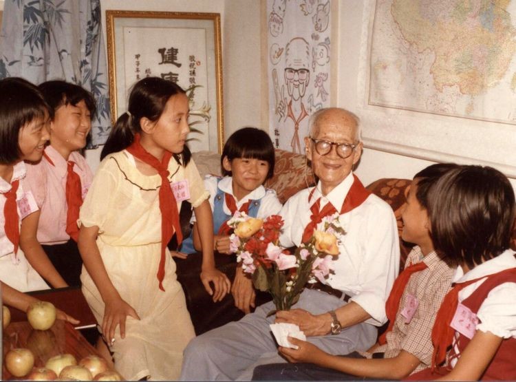 1985年教师节前夕,北京朝阳区三里屯三小的学生慰问“故事爷爷”孙敬修