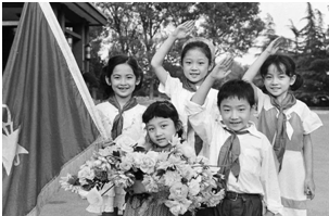 1985年拍摄的5位少先队员向老师敬礼的照片