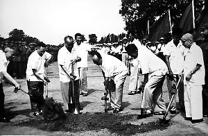 朱德、邓小平、彭真等国家领导人在北京地铁一期工程开工典礼上挥锹铲土