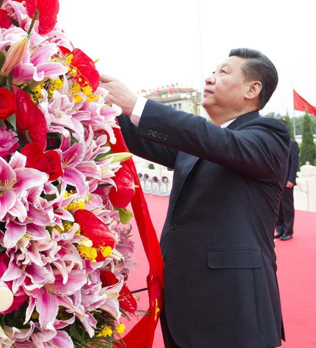 2014年9月30日上午,习近平等党和国家领导人来到北京天安门广场,出席烈士纪念日向人民英雄敬献花篮仪式。这是习近平整理花篮上的缎带。