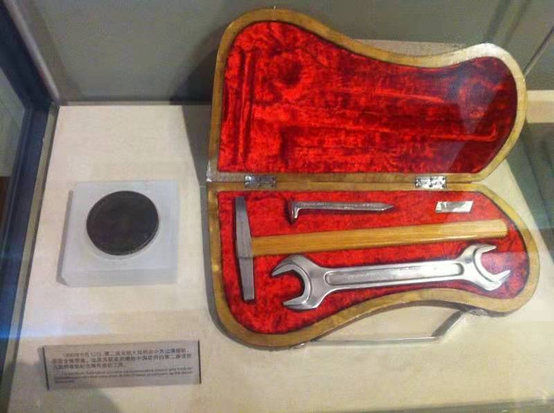 △收藏于国家博物馆的新亚欧大陆桥接轨纪念牌和接轨工具