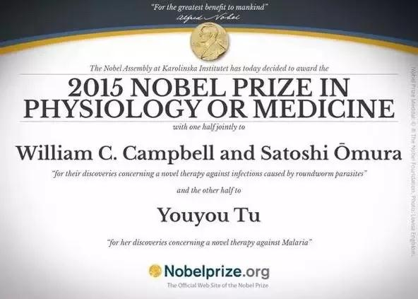 2015年10月5日,“诺贝尔生理学或医学奖”获奖名单揭晓,中国女药学家屠呦呦获奖。这是中国科学家因在本土进行科学研究而首次获得诺贝尔科学奖,也是中医药成果获得过的国际最高奖项。