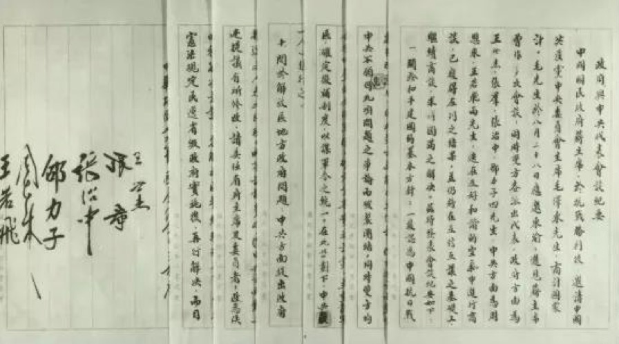 1945年10月10日下午,中共代表与国民党代表在重庆桂园客厅签署了《政府与中共代表会谈纪要》,史称《双十协定》。根据协议,国民党政府接受中共提出的和平建国的基本方针,双方还确定召开各党派代表及无党派人士参加的政治协商会议,共商和平建国大计。