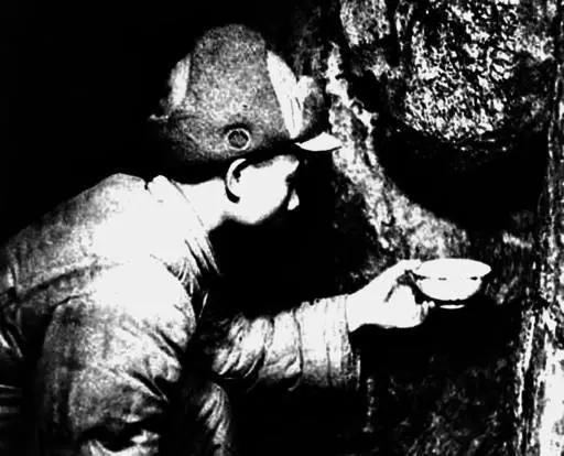 △志愿军战士在坑道中接岩石上滴下的水