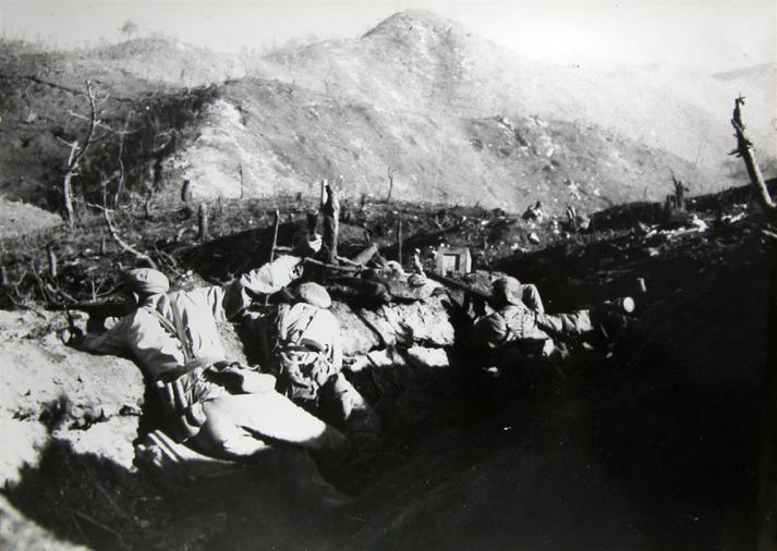 △坚守在上甘岭阵地上的志愿军战士向敌人射击