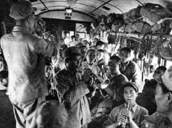 △列车中响起了志愿军高唱“雄赳赳,气昂昂”的雄壮歌声