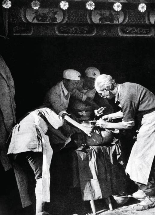 1939年,白求恩在河北涞源孙家庄小庙为伤员做手术。(沙飞 摄)