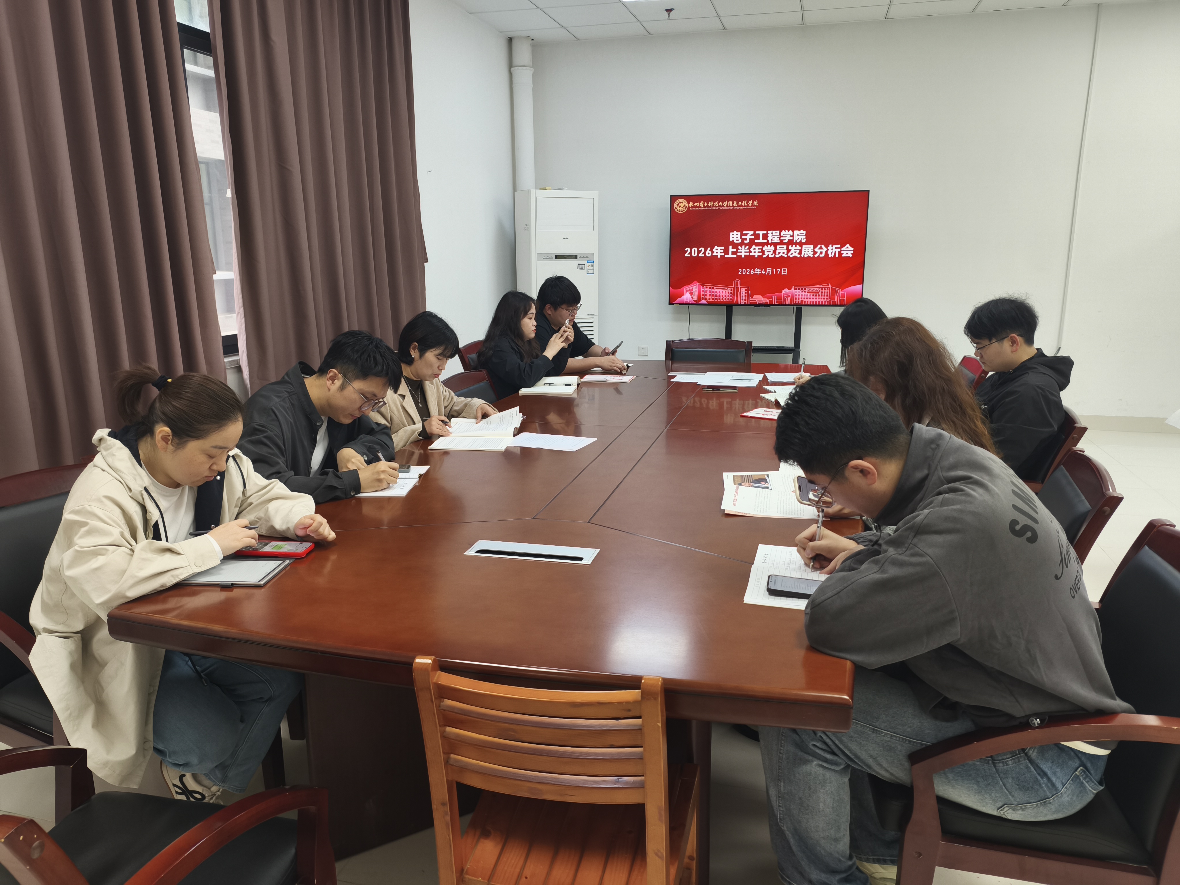 4月17日上午,电子工程学院在A307会议室召开2026年上半年党员发展工作专题分析会,会议由党总支书记俞优姝主持,党总支副书记马焕、组织员卢钰奋及各党支部书记参加。