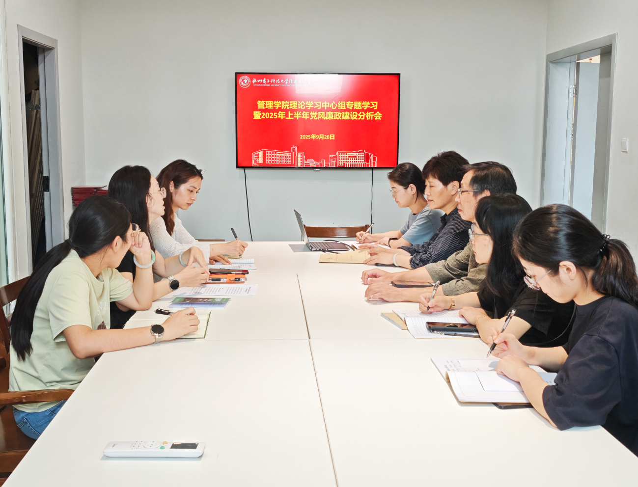 9月28日上午,管理学院理论学习中心组召开专题学习会暨2025年上半年党风廉政建设分析会。会议传达学习了习近平总书记关于深入贯彻中央八项规定精神的重要指示,以及中央、省委党的建设工作领导小组会议精神,全面总结学院学习教育开展情况和党风廉政建设工作成效,并就巩固拓展学习教育成果、推进作风建设常态化长效化作出部署。学院党总支书记潘慧灵主持会议并领学,理论学习中心组成员参加会议。