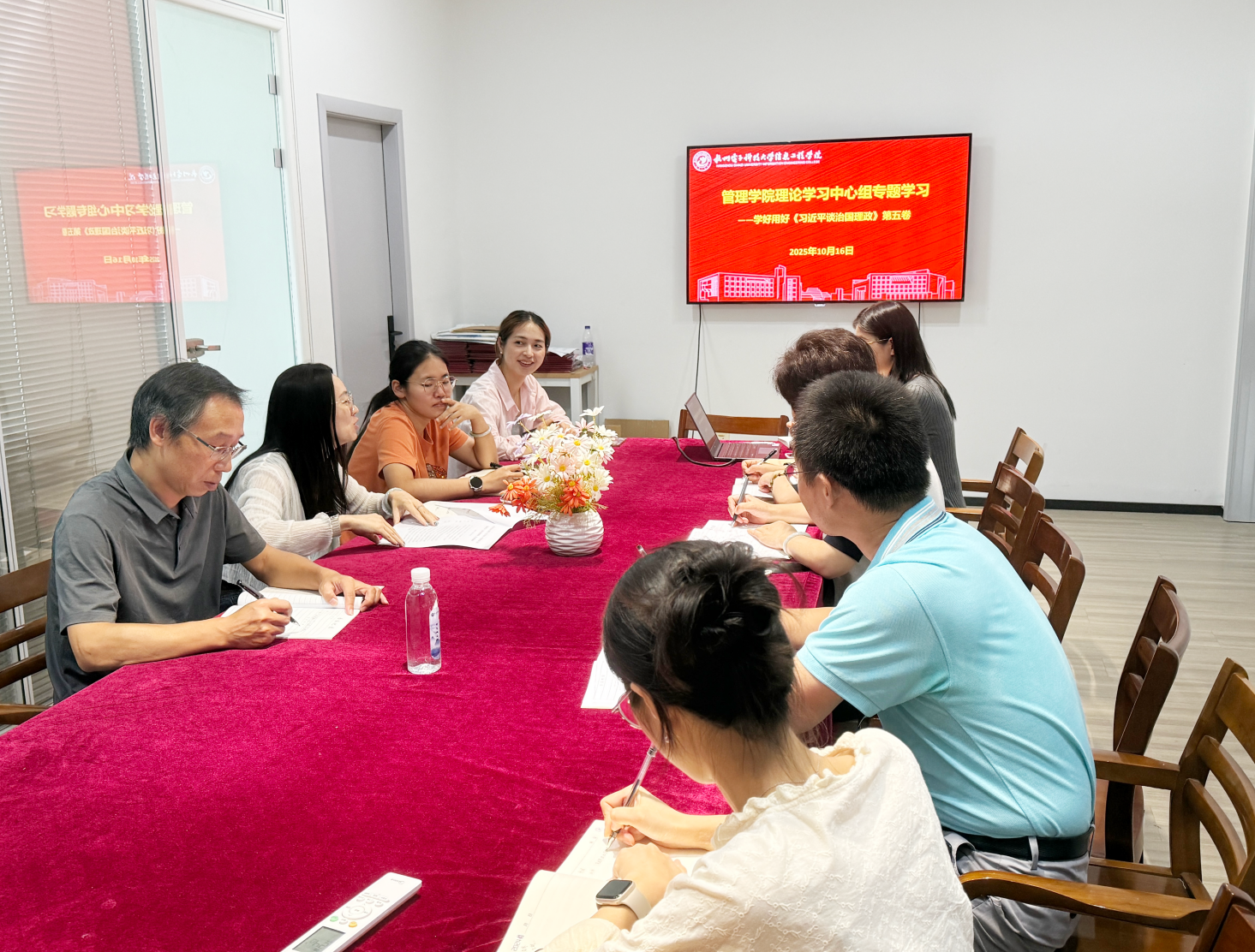 10月16日上午,管理学院理论学习中心组召开专题学习会,深入学习研讨《学好用好<习近平谈治国理政>第五卷》的重要论述。管理学院党总支书记潘慧灵主持会议,副院长牟辉领学,党总支理论学习中心组成员参加会议。