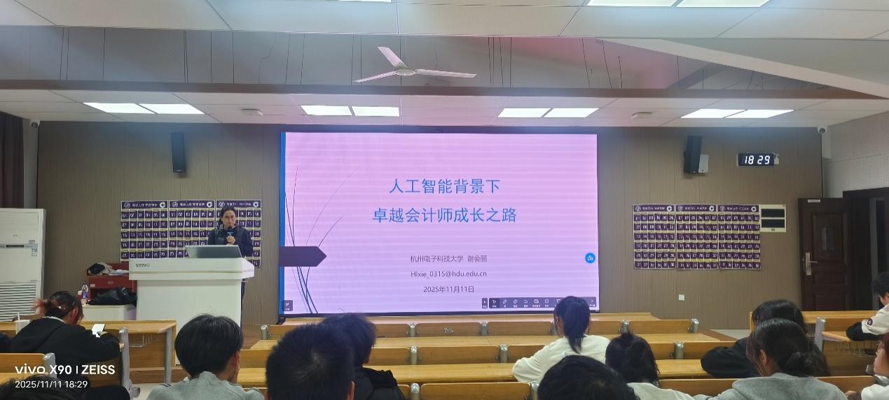 11月11日晚,管理学院邀请杭州电子科技大学会计系主任谢会丽副教授,做了主题为“人工智能背景下卓越会计师成长之路”的专题讲座,财会专业本科新生现场聆听学习,智能财务方向班负责人余冰冰等老师出席讲座。