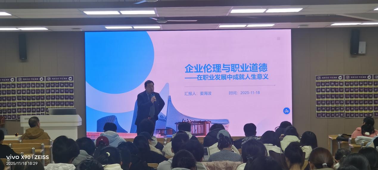 11月18日晚,管理学院姜海波博士为25级财会新生举办“企业伦理与职业道德”专题讲座。讲座聚焦财会行业诚信底线、职业道德等核心话题,综合了企业伦理学、儒家伦理、共同体思想与叙事理论,从利益相关者、企业公民等概念入手,阐述了个人在职业、事业、价值三方面通过职业道德与企业的关联,并进一步从价值基础、道德根基、行为形式等方面指出职业是共同体的叙事线索,人在共同体中成就价值认同与生命意义。此次讲座旨在引导新生树立“诚信为本、操守为重、坚持准则、不做假账”的职业理念,明确财会人员在企业治理中的责任担当。新生们表示,讲座为职业生涯奠定了道德基石,将在学习中强化伦理意识,锤炼专业道德素养。