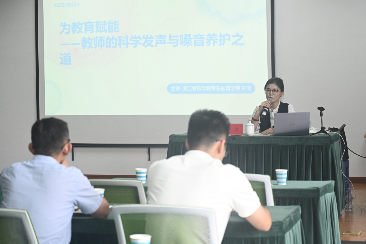本次讲座特邀浙江音乐学院王洁老师,为青年教师带来《为教育赋能——教师的科学发声与嗓音养护之道》主题讲座。王老师通过分享教师嗓音障碍的常见问题、发声原理的科学解释,并现场示范带练吹吸管、数葫芦等发声练习,有效帮助教师们掌握科学发声技巧,提升嗓音健康水平,为长期的教学工作保驾护航。
