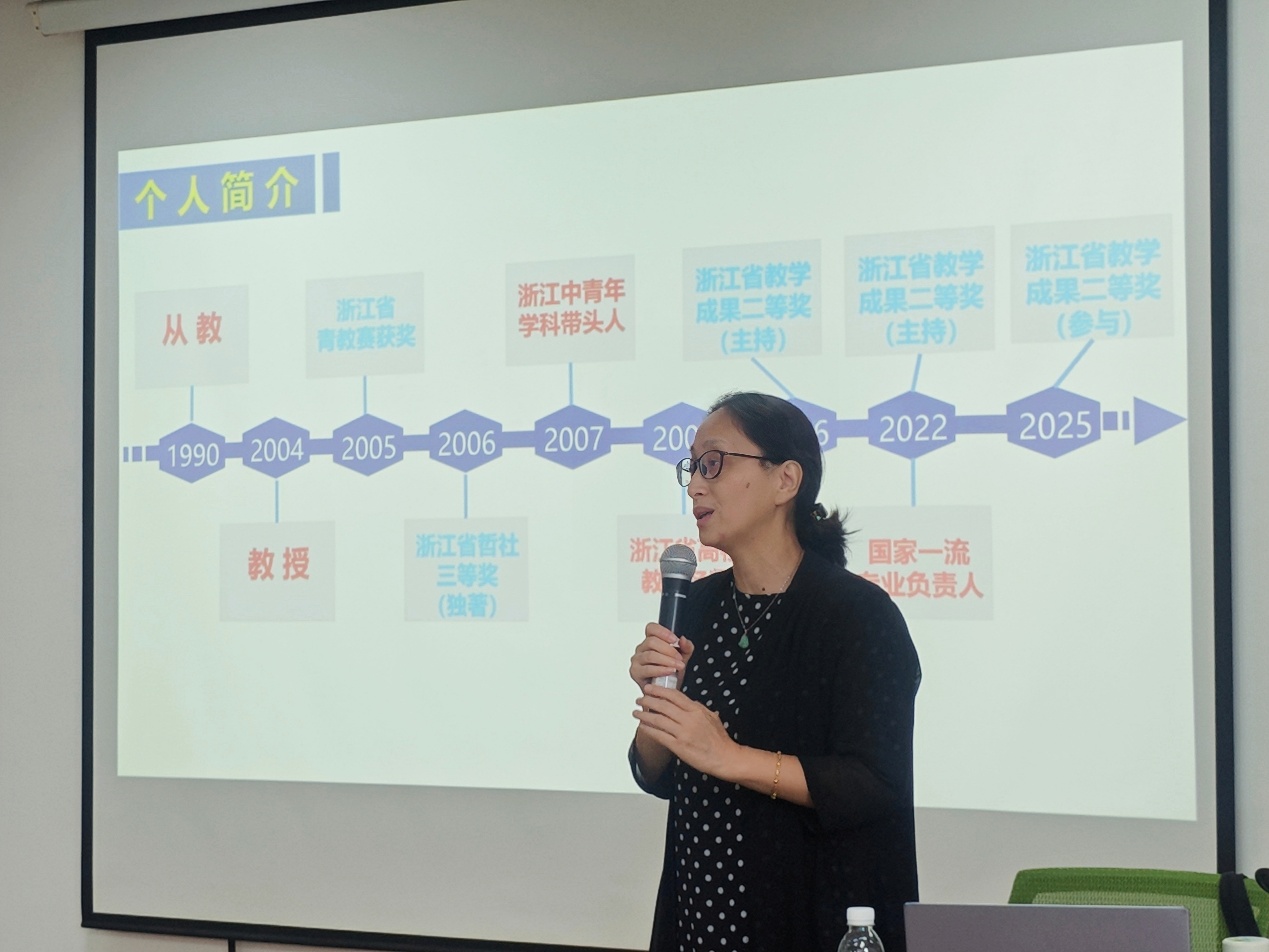 我院经济学院院长都红雯教授以《强化人工智能素养 提升课堂教学质量》为题,从社会需求与学校特色双重视角出发,阐述了人工智能素养在现代教育中的重要性。她结合自身丰富的教学经验,从教学目的设定、第一堂课设计、教学内容组织、教学方法创新、教学手段运用等维度为青年教师提供全面而实用的指导,助力其提升课堂教学质量,实现教学相长。