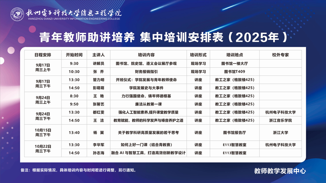 金秋送爽、启航新程,我院在青山湖校区有序开展2025年新进教职工培训暨青年教师助讲培养集中培训,目前已开展6场讲座,2次现场学习。培训内容融校史校情、师德师风、教学技能、职业素养于一体,为帮助新进青年教师站好讲台奠定了良好开端。培训由人事处和教师教学发展中心联合举办。