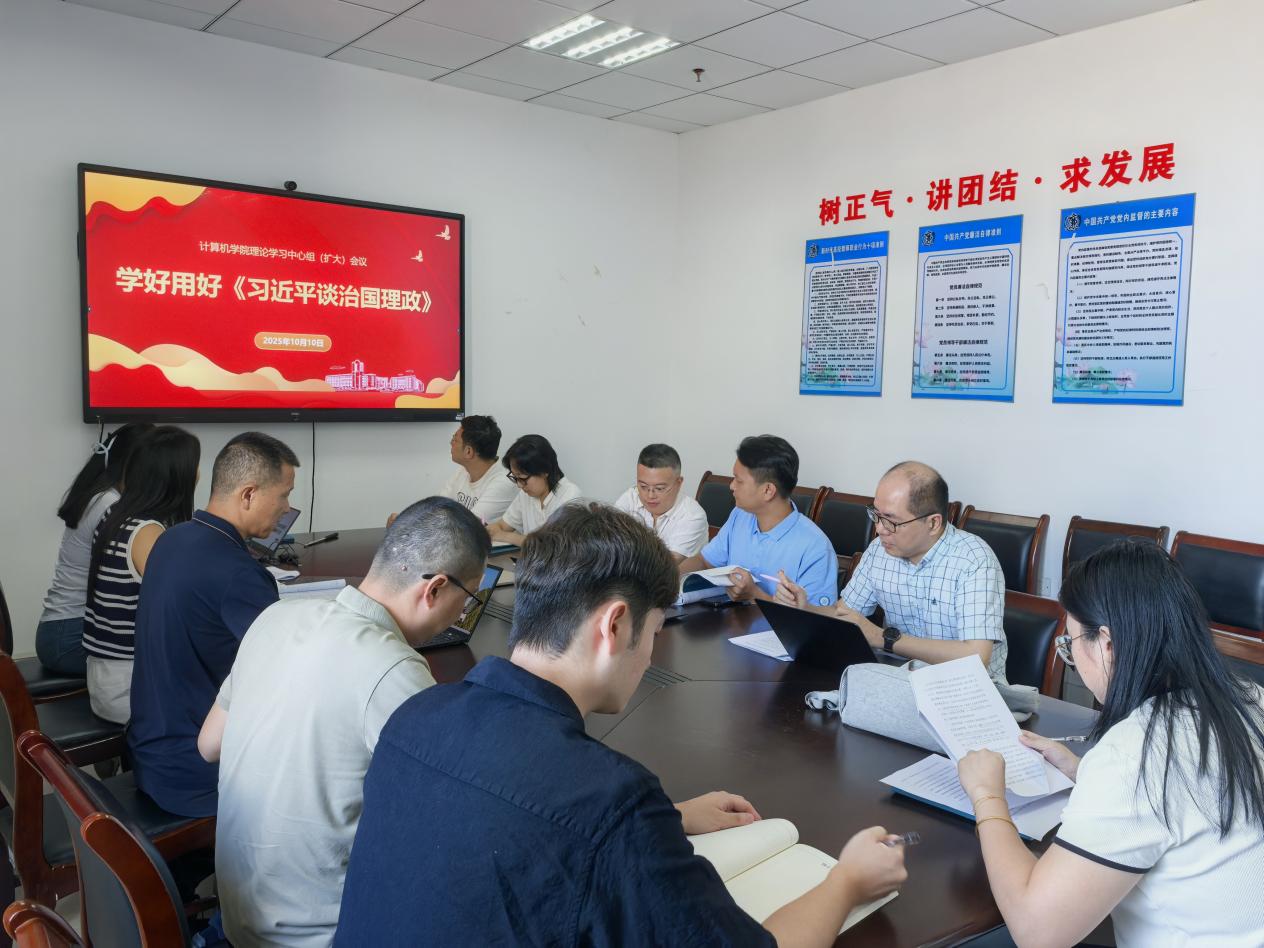 10月10日上午,计算机学院组织开展“学好用好《习近平谈治国理政》第五卷”专题理论学习中心组(扩大)会议。本次学习会由计算机学院党总支书记叶虹敏领学,执行院长张海平、副院长周梦熊、学院学习小组成员、辅导员代表、教师代表出席会议。