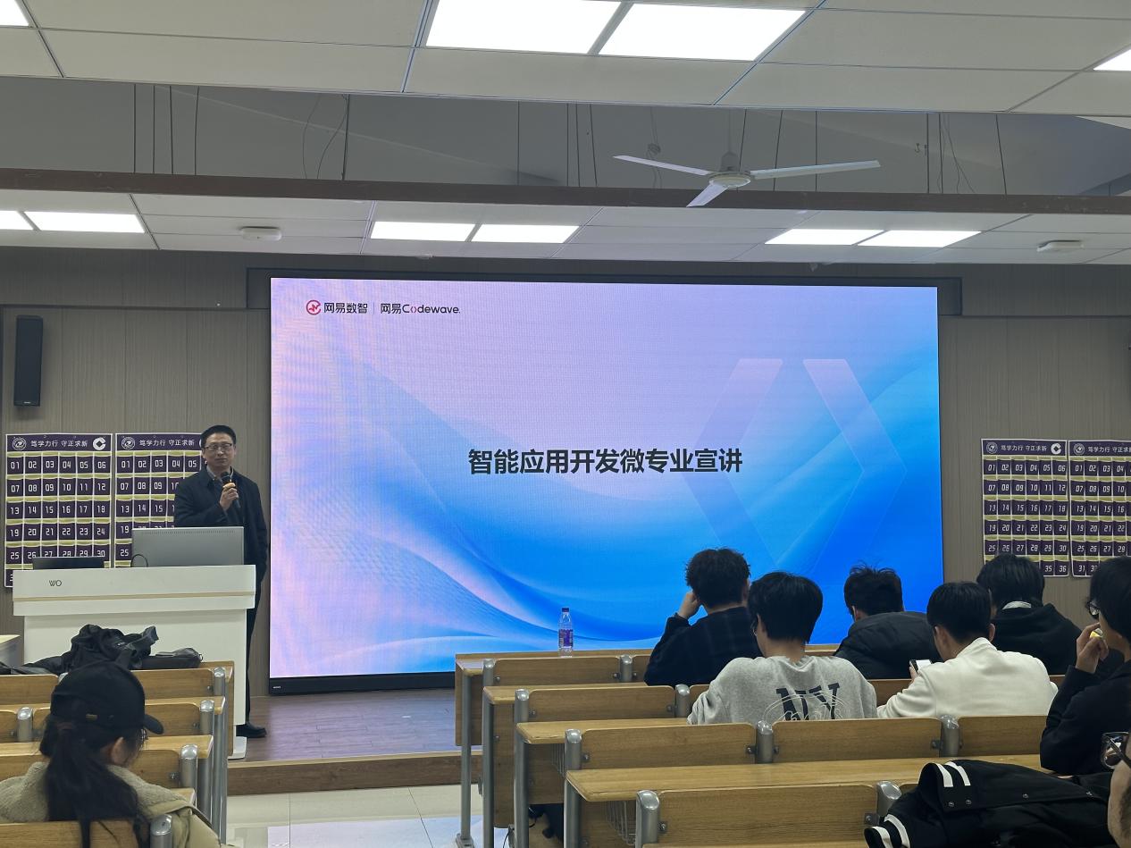 随后,他对智能应用开发微专业进行了详细解读。该专业由计算机学院与网易共建,旨在培养兼具智能应用开发素养与AI技能的复合型人才。学生将学习智能应用开发基础、AI+需求分析与产品设计等内容,并通过CodeWave平台及大模型技术开发智能应用。