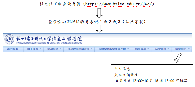 2025级新生须进行新生个人信息及火车乘车区间终点站填写和核对工作。为保障这些工作的顺利开展,请各二级学院做好指导、组织学生提前熟悉青山湖校区教务系统。学生登录教务系统后,在“信息维护”栏目当中填写个人信息和火车乘车区间终点站,这些信息均与学信网学籍注册、学生证、优惠火车票购买、学籍卡的信息相关联,因此请学生必须认真填写和核对,信息核对完成后学院会根据核对后的信息进行2025级新生的学信网学籍注册、办理学生证等工作。现将相关工作安排通知如下: