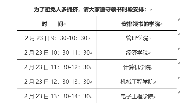 4、本次领书按照各二级学院划分时间段,请各班级按照安排的时间段到场领取教材,不要迟到,书量较多的班级请提前安排好学生搬书,以免影响正常领书秩序,服从现场维持秩序的工作人员的安排。