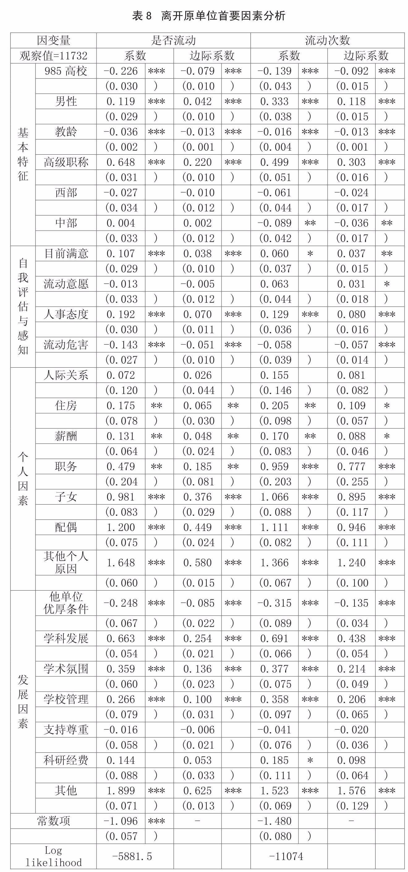 结果表明(表8),不同影响因素在影响流动决策和流动次数上的特征十分相似。相对于职称来讲, 子女、配偶、其他个人原因和其他未列明原因是显著影响人才流动决策和流动频次的最主要原因;其次是 职务、学科发展、学术氛围和学校管理等因素;而薪酬和住房的影响力再次之;人际关系、支持尊重和他单位优厚条件的影响力并不显著。