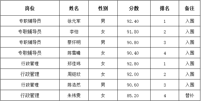 入围人员的体检、政审等考察考核手续,待学院另行通知。体检、政审、考察等环节如不合格,将取消拟录用资格。