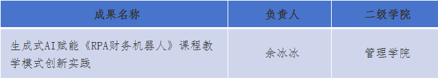 近日,浙江省高等教育学会实验室工作分会公布了《关于公布2024-2025年浙江省高校实验室工作研究成果奖获奖名单的通知》(浙实发〔2025〕11号),我院余冰冰老师负责的《生成式AI赋能〈PRA财务机器人〉课程教学模式创新实践》研究成果被评为2024-2025年浙江省高校实验室工作研究成果奖二等奖。我院教师荣获此项嘉奖,正是他们在探索AI赋能教学与实验室工作方面积极创新、成功实践的集中体现。