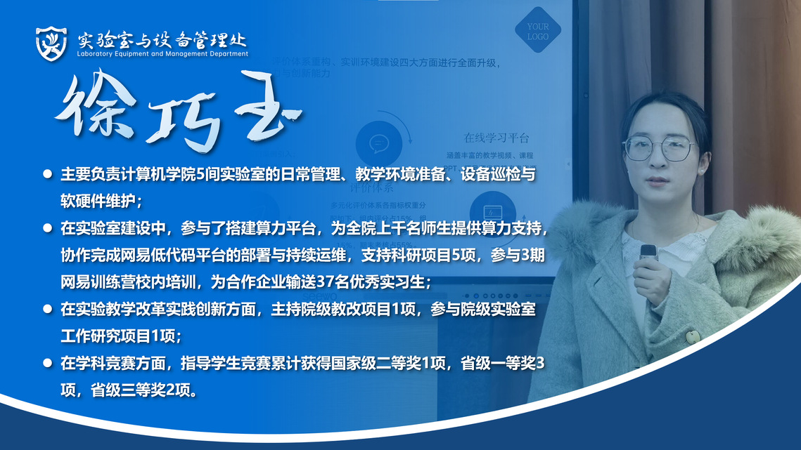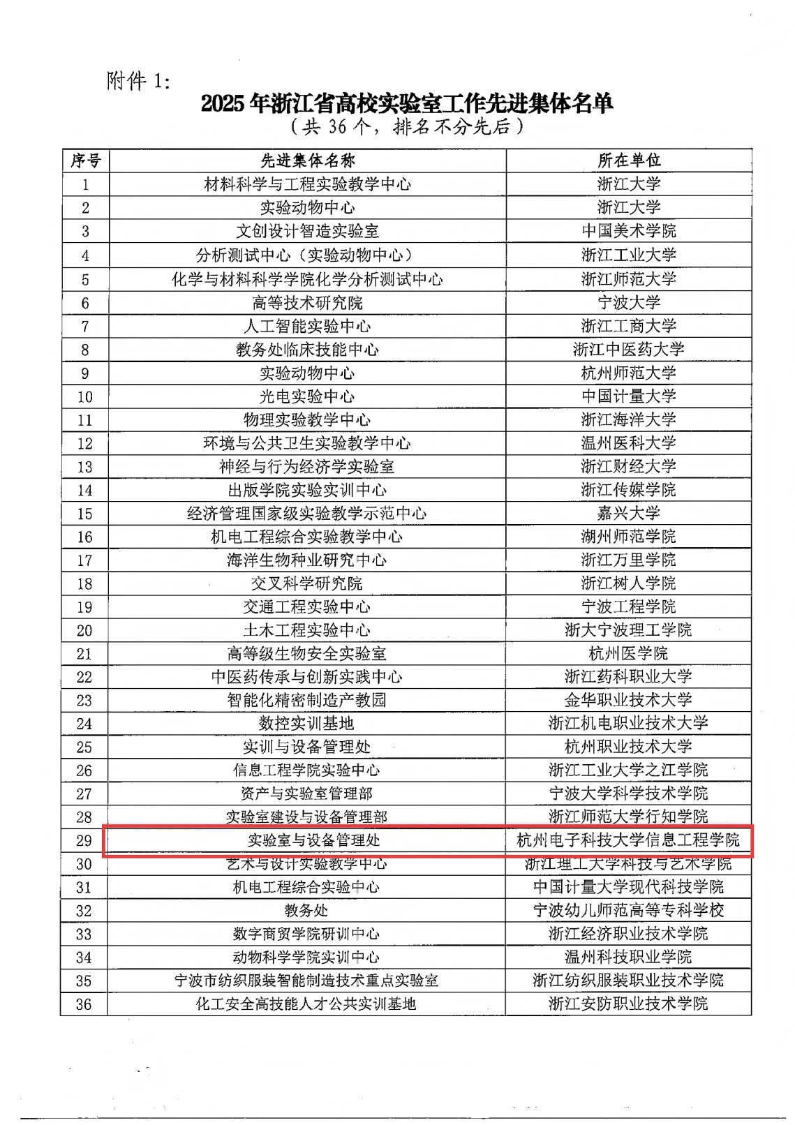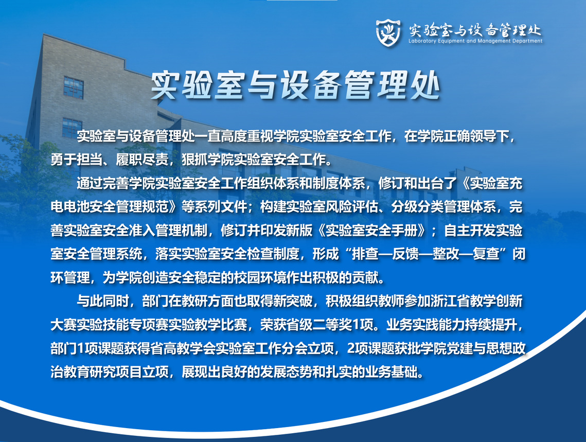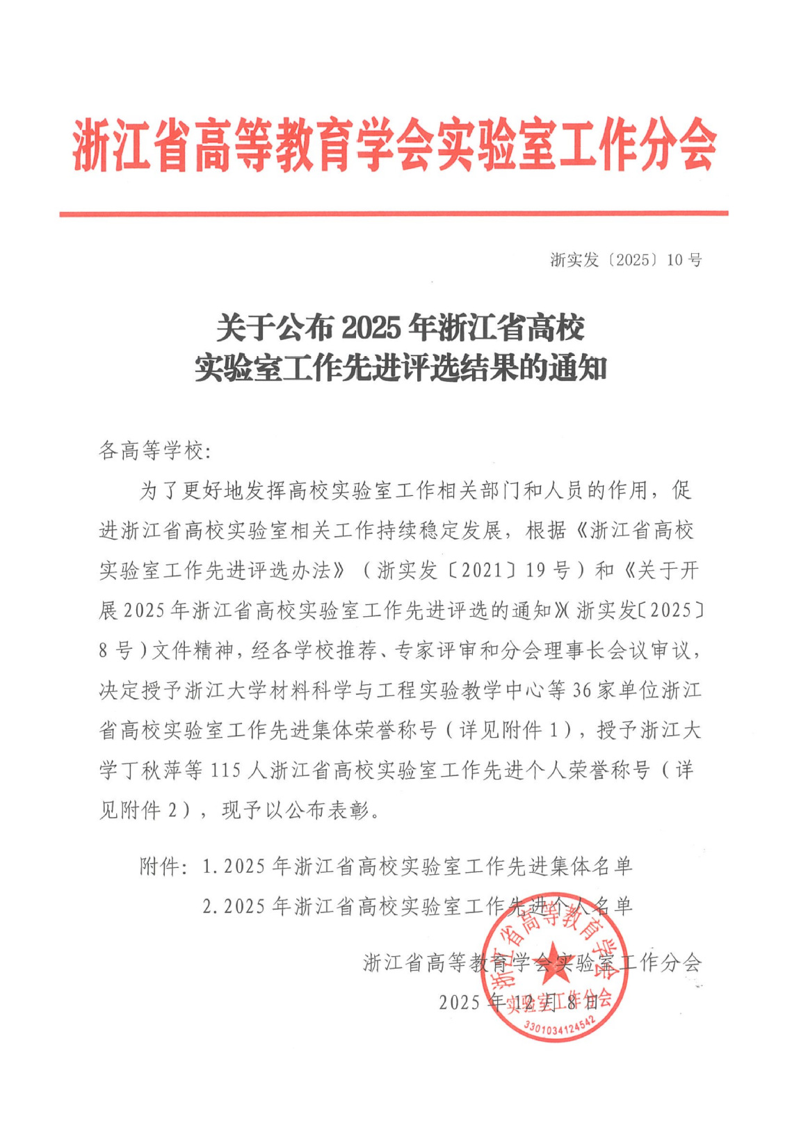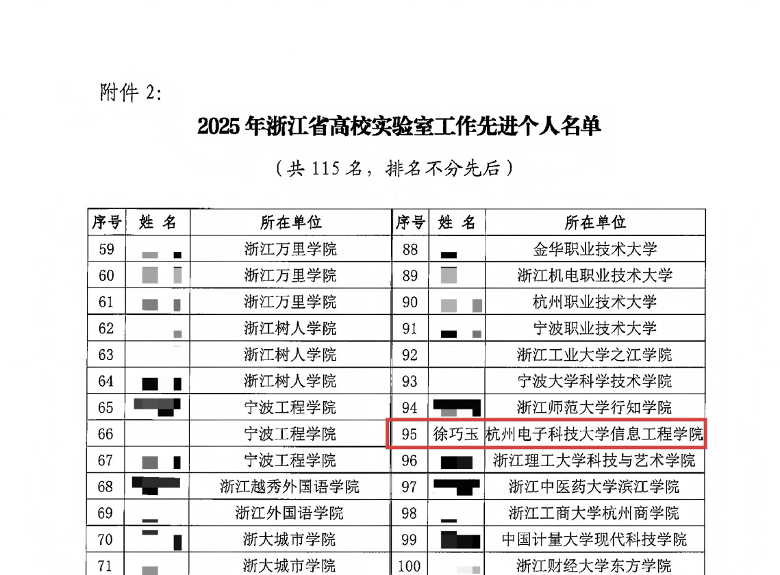 近日,在浙江省高等教育学会公布的2025年实验室工作先进评选结果中,我院在实验室工作领域喜获双项荣誉:实验室与设备管理处获评“浙江省高校实验室工作先进集体”,计算机学院徐巧玉老师被授予“浙江省高校实验室工作先进个人”称号。