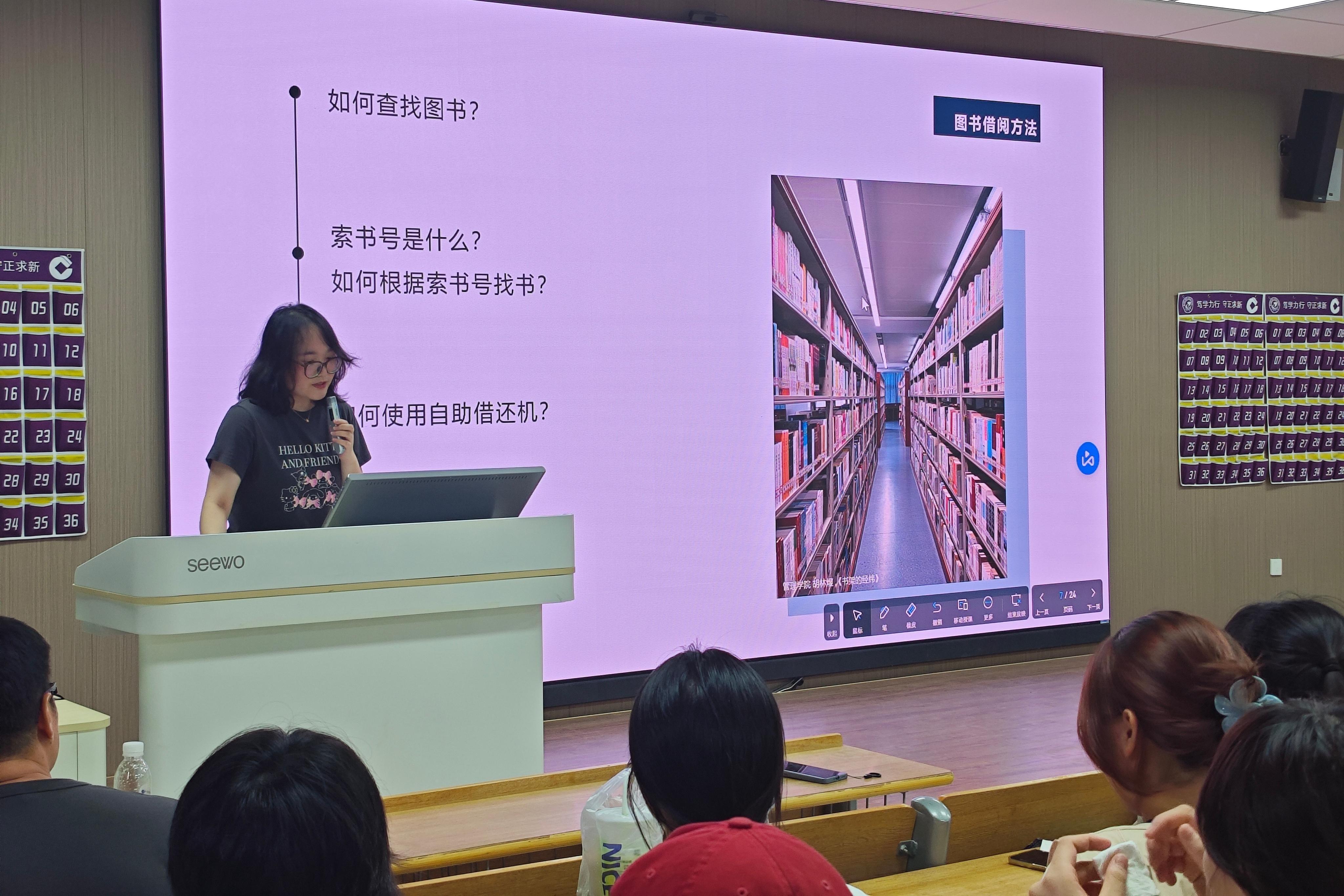 图书馆老师们从入馆规范、馆内常用区域、图书借阅方法、电子资源使用方法等方面做详细讲解,并提醒学生在利用图书馆时需注意的几点事项。