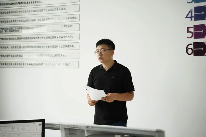纪检监察审计办公室主任臧伟坡着重强调了录取阅档环节的工作纪律要求,明确了招生纪律红线与行为规范;招生就业办公室主任李亭则围绕阅档流程和材料核查,细致说明了具体注意事项,为阅档工作提供了操作指引。